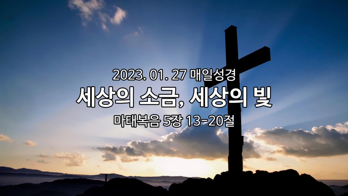 2023년 1월 27일 매일성경 페이지 정보 작성자 Joshua 댓글 0건 조회 1,002회 작성일 23-01-27 11:13 목록 본문 세상의 소금, 세상의 빛 마태복음 5장 13-20절 이전글2023년 1월 28일 매일성경 23.01.28 다음글2023년 1월 26일 매일성경 23.01.26 댓글 0 댓글목록 등록된 댓글이 없습니다.
