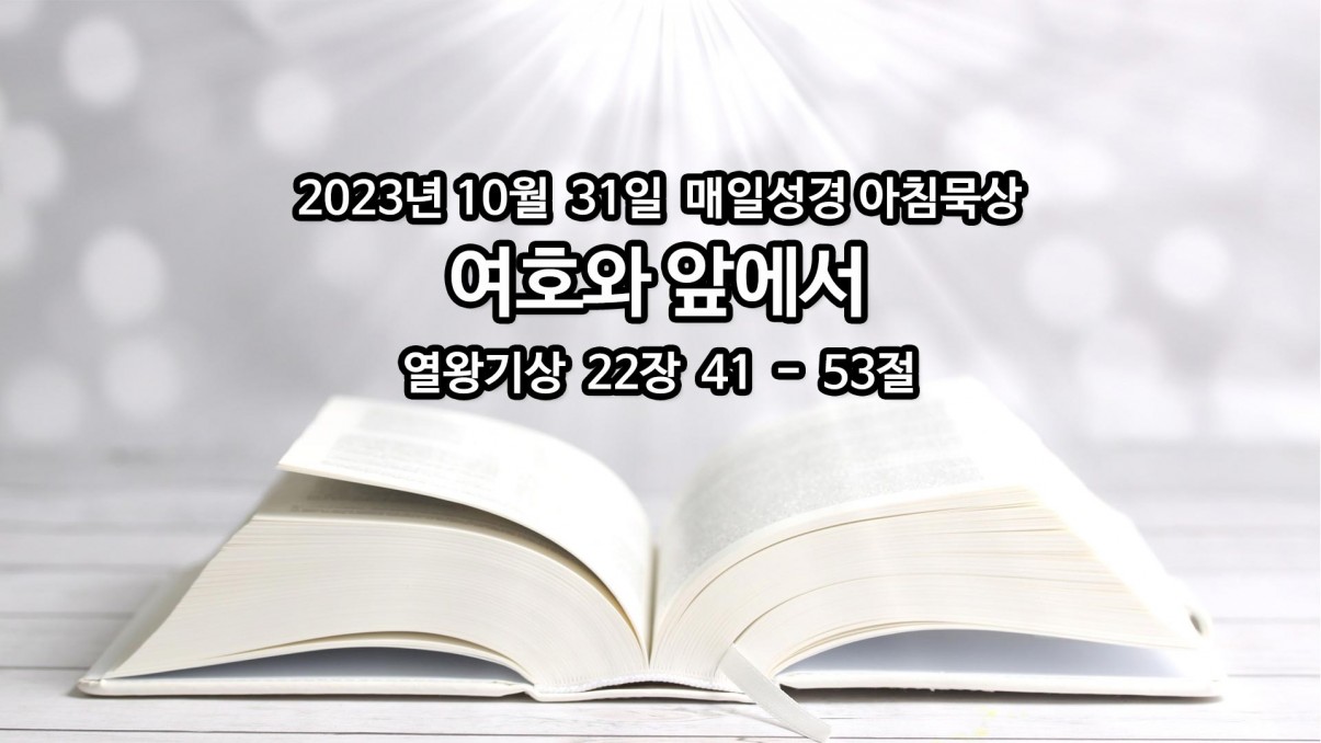 2023년 10월 31일 매일성경 아침묵상 페이지 정보 작성자 Joshua 댓글 0건 조회 660회 작성일 23-10-31 07:04 목록 본문 여호와 앞에서 열왕기상 22장 41-53절 이전글2023년 11월 01일 매일성경 아침묵상 23.11.01 다음글2023년 10월 30일 매일성경 아침묵상 23.10.30 댓글 0 댓글목록 등록된 댓글이 없습니다.