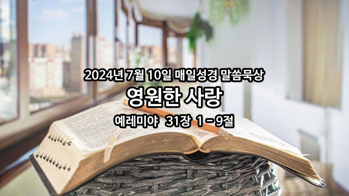 2024년 7월 10일 매일성경 말씀묵상 페이지 정보 작성자 Joshua 댓글 0건 조회 263회 작성일 24-07-10 08:25 목록 본문 영원한 사랑 예레미야 31장 1 – 9절 이전글2024년 7월 11일 매일성경 말씀묵상 24.07.11 다음글2024년 7월 9일 매일성경 말씀묵상 24.07.09 댓글 0 댓글목록 등록된 댓글이 없습니다.